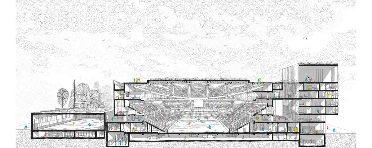 CHYBIK + KRISTOF’s design for the new Jihlava Multipurpose Arena revisits the existing structure of the building, initially developed as the home stadium for the regional ice hockey club. A multifunctional space with a capacity of 5,600 spectators, the project extends the stadium’s original purpose by creating a versatile space, adapted to both its primary sporting purposes within state-of-the-art facilities and a broad spectrum of activities – and their respective audiences. Located on the border of Jihlava’s historical center, the arena – a structure usually confined to the periphery of cities – is adjacent to a park and university and places itself in the continuity of these two spaces. The several public spaces nested throughout the four- building “urban stadium” allow it to melt into the surrounding urban landscape. Rather than marking an interruption in the existing city structure, the arena serves as a transparent and fluid transition between seemingly distinct spaces, thereby reviving and opening up the area to new functions, and ultimately extending the city center beyond its strict historical bounds. In this new permeable space, which the inhabitants are encouraged to invest in their daily lives, the architectural framework lays the foundations for the prominent notions of free movement and interaction.