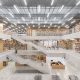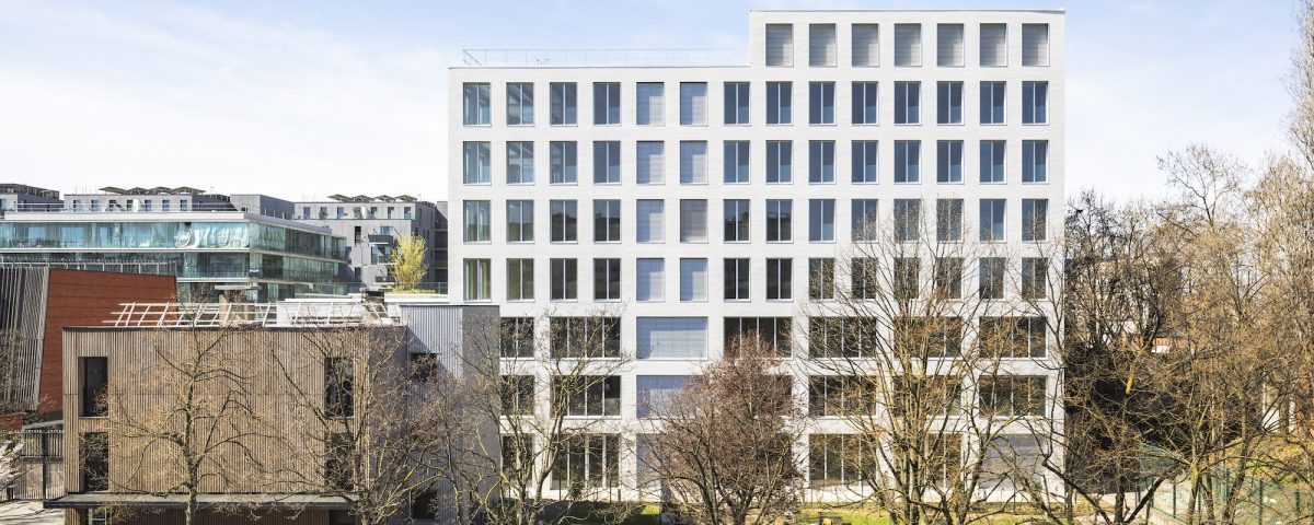 The stress-bearing structure punctuates the façades, creating the possibility of large glazed bays allowing light to flood the interior. Each bay is outlined by pale-colored metal frames. The architecture is reminiscent of industrial buildings or “daylight factories,” whose volumes and skins were determined by the requirement of a maxim amount of daylight.