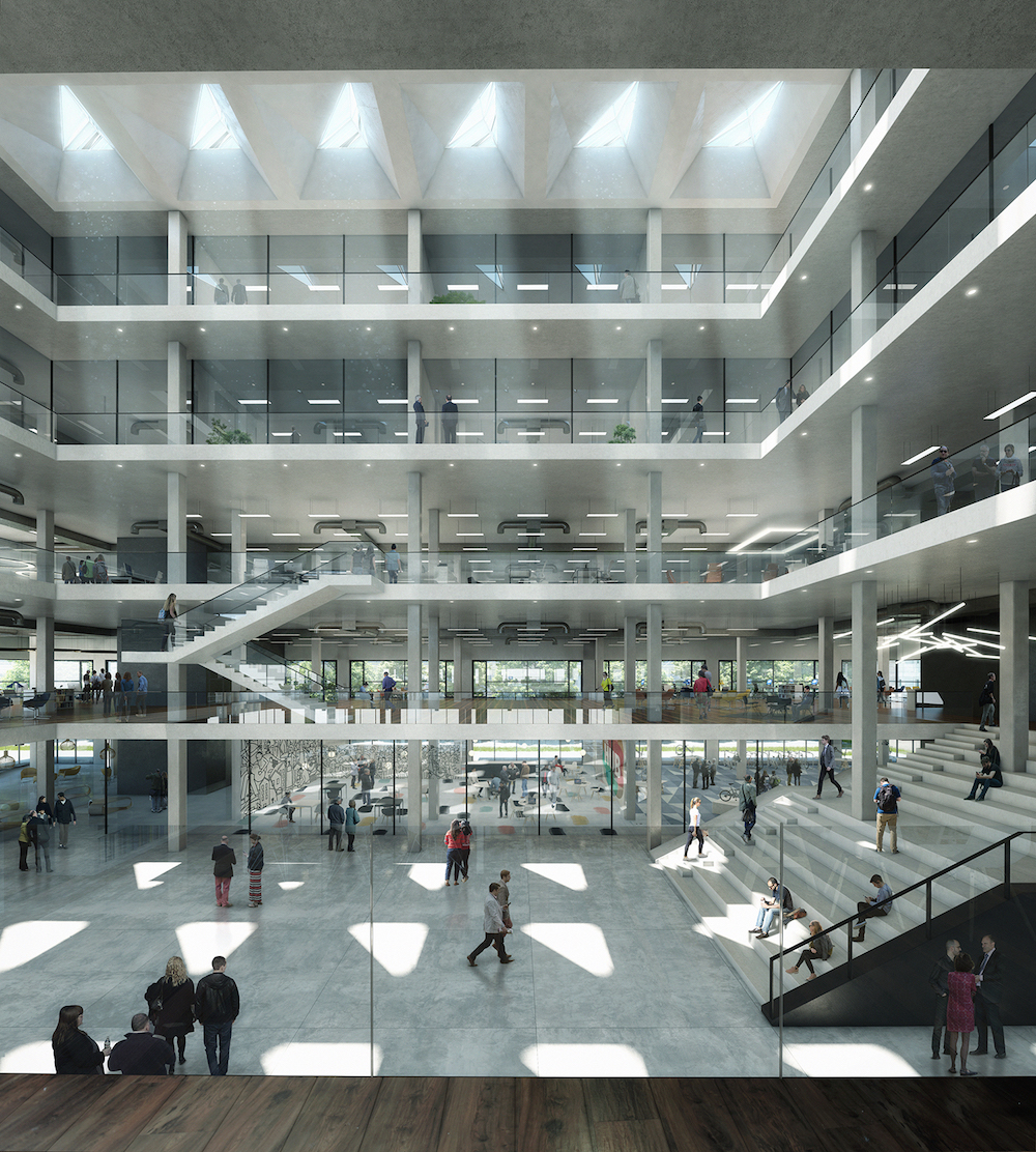 Moreover, the roof is treated as the fifth facade, going beyond its function as a mechanical and technical space, to become a living, breathing part of the buildings. The atrium roofs incorporate distinct glass openings, designed in a triangular shape to maximize resourceful use of glass and thereby prevent overheating.