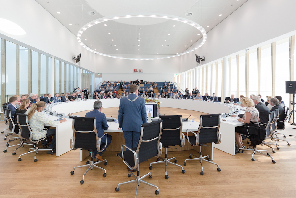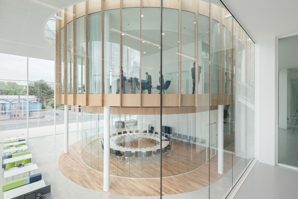 The transparent atrium façade offers passers-by a direct view on the administrative functions, while the wooden slats nevertheless make for a sense of demarcation as well as lend the administrative furniture-piece a special appearance and dignity. The high degree of insight and transparency is inviting and the light and warm appearance accommodates an agreeable working environment. The layout of the different services is logical, natural and clear. The boardroom is sizable and many rooms are multifunctional. Movable wall panels grant maximum flexibility and adaptability. During the day, the committee rooms can be used as meeting rooms. When the flexible walls are fully opened, a large open space for press conferences, parties, weddings, exhibitions and large gatherings comes into being.