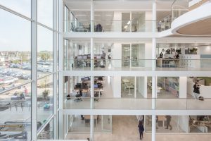 Open staircases are prominently positioned, stimulating their own use and with that a healthy use of the building. Daylight gets through everywhere and is omnipresent. The materials are robust, need little maintenance and were produced sustainably.