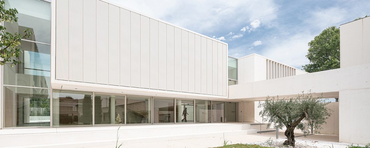 The architecture of this extension to the existing building of the MMSH has been designed in an understated and elegant Mediterranean style composed of large masses with reduced apertures. This inward-looking construction surrounds a central landscaped garden.