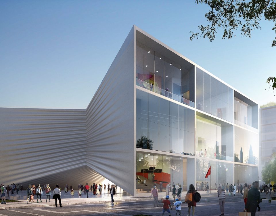 Located in the cultural and administrative heart of downtown Tirana, adjacent to the iconic Skanderbeg square, the National Opera and the National Art Gallery, the cultural space will replace the existing theatre and add three new indoor performance spaces, a rooftop amphitheater as well as a covered public space underneath the building.
