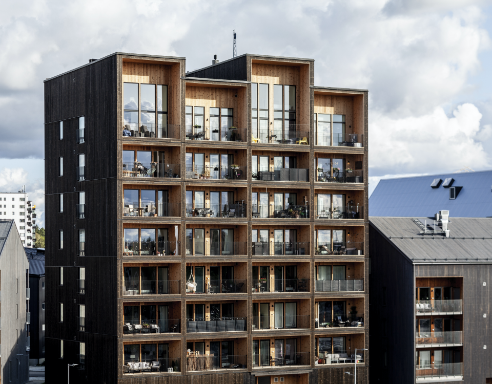 The Tall Timber Building residence has become a landmark and, during construction, became Sweden's tallest solid wooden building in the new district of Kajstaden at Lake Mälaren in Västerås.