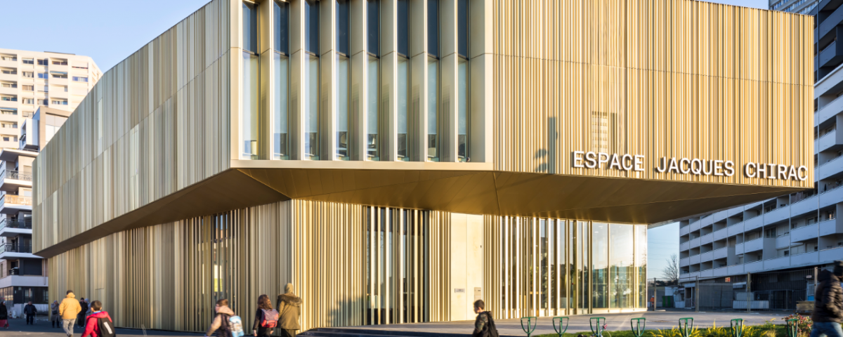 The seemingly levitating volume encircles patios like a ribbon while opening widely to the neighborhood through large openings framing atypical rooms such as the visual arts galleries or the media library. Thanks to its specific volume and dynamic identity, the new facility fits naturally into its context by symbolically signaling its presence in the heart of this district undergoing a major redevelopment.