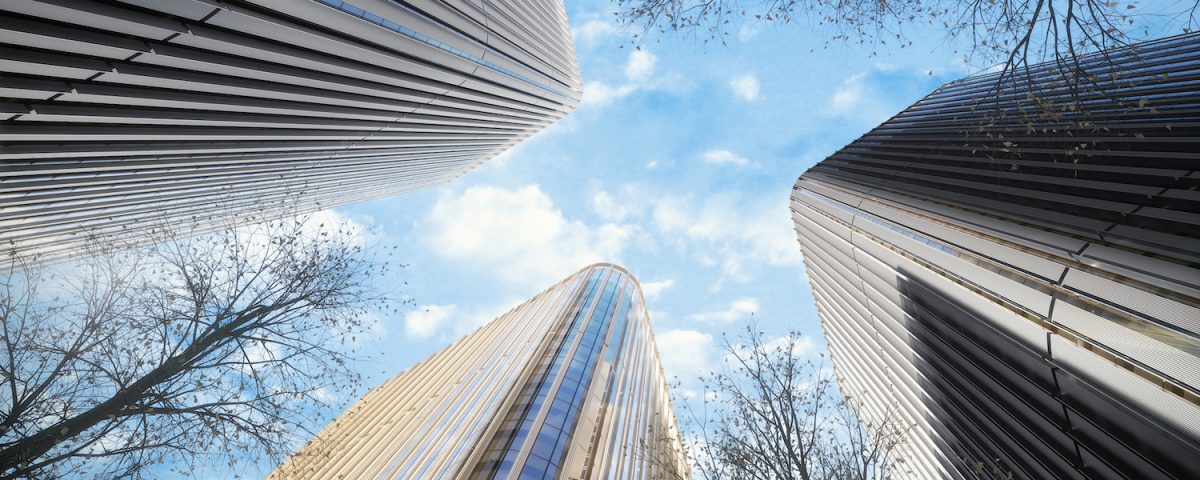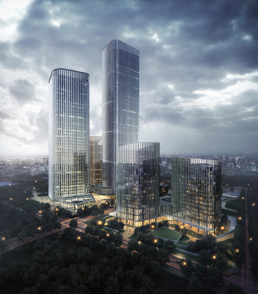 A group of five towers of varying heights – the tallest 270 metres high – forms the plaza of the new central business district. The structure of the development site reconciles the differing patterns of the adjacent urban fabric, using the overlappings to define a distribution of diamond-shaped lots that constitute the footprints of the new centrepiece highrises.